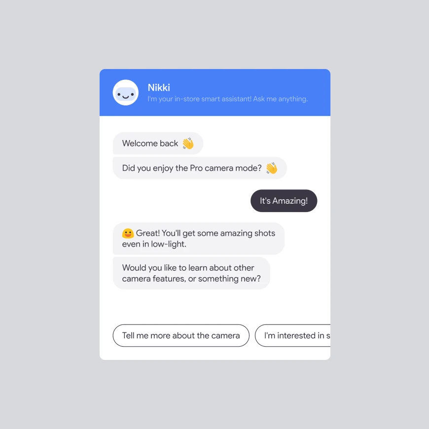 We created “Nikki” – a custom chatbot to discuss phone features and specs with users, through the in-store display units. Pre-built replies made conversations straightforward and were categorized by sentiment (positive, negative, neutral) for analytics. This data could aid with future device development and marketing focus.
